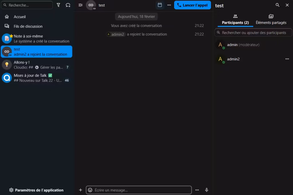 Nextcloud talk permet de faire de la visioconférence. Il prend en charge le partage d’écran, l’utilisation de la webcam ainsi que les communications écrites. Finalement, c’est comparable à Microsoft Teams, mais en version web, directement intégré à Nextcloud.