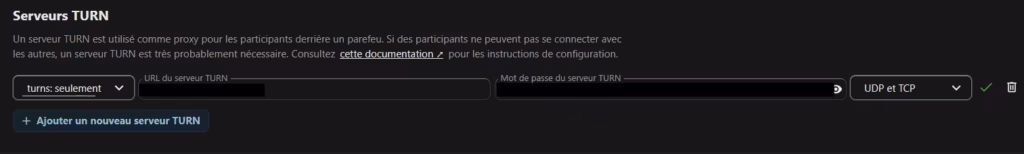 Note : bien que le conteneur fournisse un serveur STUN/TURN, la partie TURN n’étant pas sécurisée en TLS, les services STUN et TURNS sont entièrement pris en charge par Coturn, déjà configuré avec TLS.